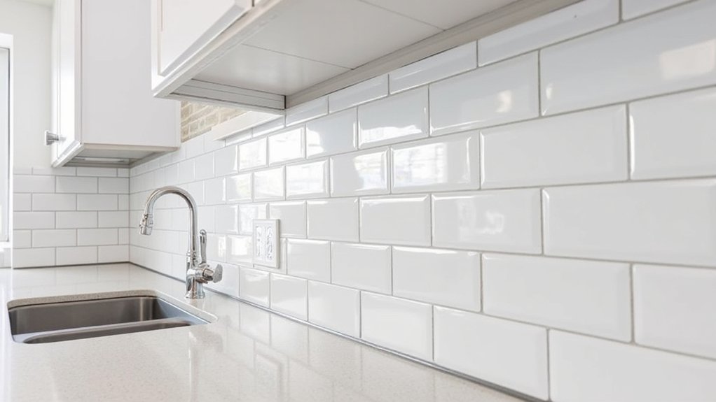 While exploring kitchen backsplash options, consider the timeless appeal of chic subway tiles for a clean, modern look. These 3×6 inch rectangular tiles, often ceramic or porcelain, create a sleek vibe in your kitchen. Install them in a classic brick pattern for best results.