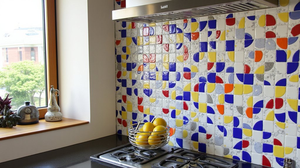 Moving from the sleek simplicity of subway tiles, you can explore a bolder choice with vibrant terrazzo patterns for your kitchen backsplash. These designs mix colorful chips in a 12×12-inch tile, creating a lively yet durable surface. Install them over a 3-foot-high area for impact.