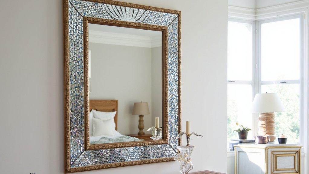 Elevating your bedroom’s charm, consider adding an intricate mosaic mirror as a stunning wall accent. This piece, often 24×36 inches, instantly transforms your space with its detailed, handcrafted design. Hang it above your dresser for a focal point that reflects light beautifully. “A mosaic mirror adds depth and artistry,” says interior designer Lisa Grant.