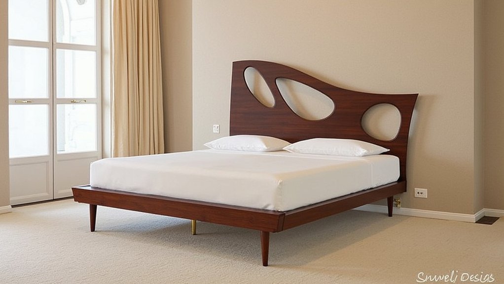 Let’s shift focus from cozy velvet pillows to a bold centerpiece with a stunning sculptural bed frame. You can transform your bedroom into a gallery-like space with this striking choice. Opt for a frame that’s 80 inches long and 60 inches wide, crafted from polished walnut or sleek metal.