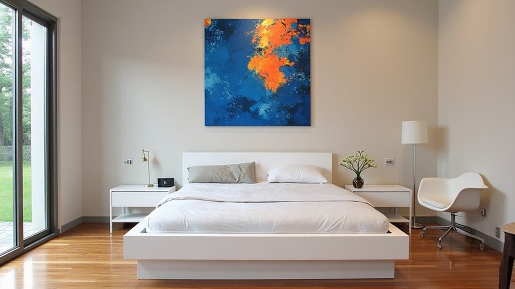 Many bedroom spaces can transform with a striking art installation that grabs the eye instantly. You’re creating a focal point, so pick a bold piece that fits your vibe. Hang a 36×48-inch canvas above your bed within 7 days of planning for quick impact.