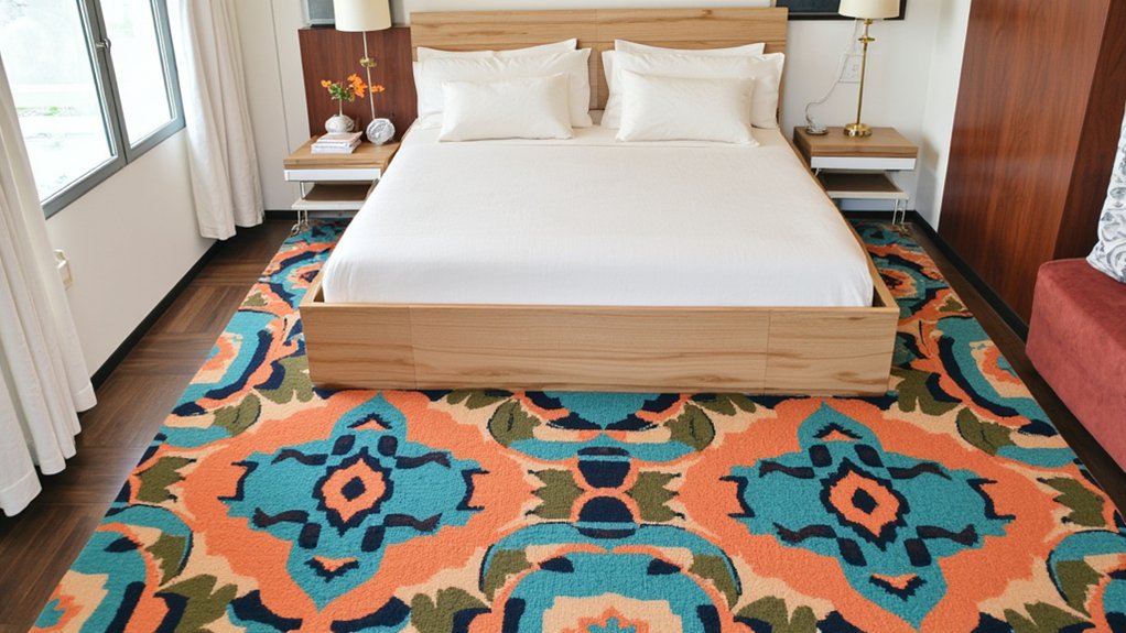 Moving from bold art to another impactful element, let’s focus on adding a vibrant patterned rug to your bedroom. A bold rug can transform your space instantly, grounding the room with style. Choose a rug around 8×10 feet for a queen bed, placing it under the frame within two days of purchase.