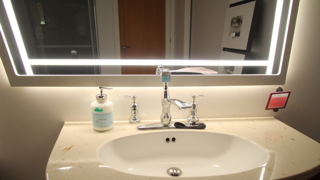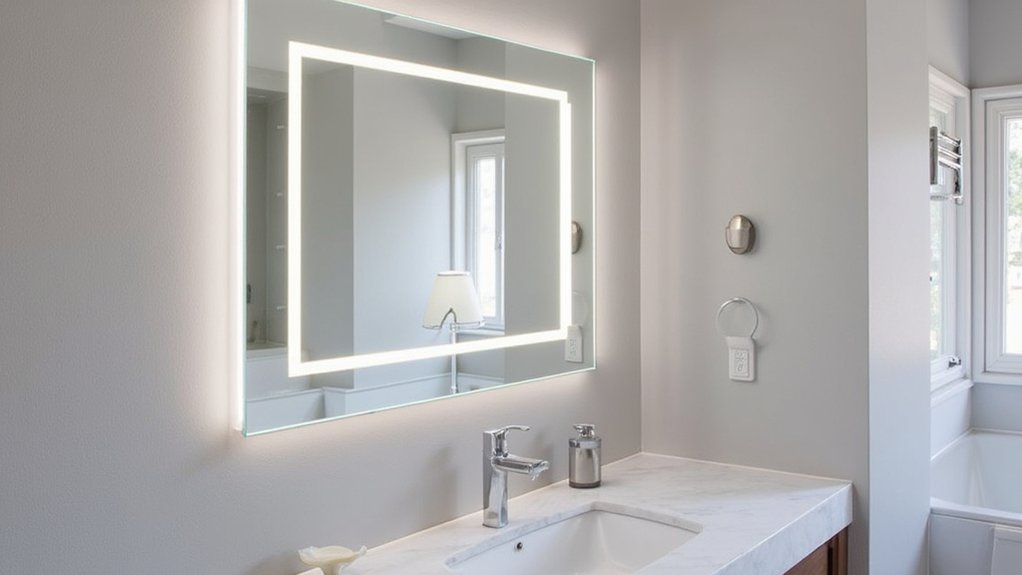 As you explore bathroom lighting options, consider backlit vanity lighting for a sleek, modern touch around your mirror. It’s a simple way to elevate your space with soft, even illumination for daily tasks. Install it behind a 36-inch-wide mirror for best results, ensuring a 6-inch offset from the edges.