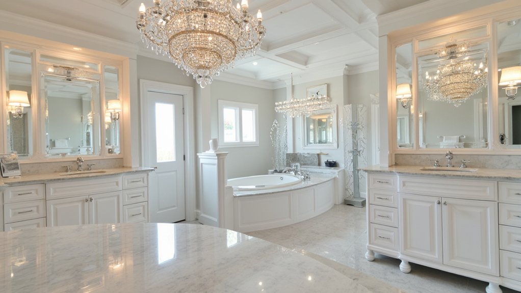 Elevating your bathroom’s style with chandelier lighting can transform the space into a luxurious retreat. You’re not just adding light; you’re crafting elegance with a stunning centerpiece. Choose a chandelier that’s 18-24 inches wide for a standard bathroom of 8×10 feet, ensuring it hangs 7 feet above the floor for safety.
