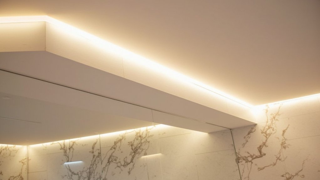 While transforming your bathroom’s ambiance, recessed cove lighting offers a sleek, modern glow that’s easy to install. You’ll love how it hides in ceiling or wall recesses, casting a soft, indirect light. “It’s perfect for a calming vibe,” says lighting expert Jane Doe, suggesting a 6-inch depth for ideal effect.