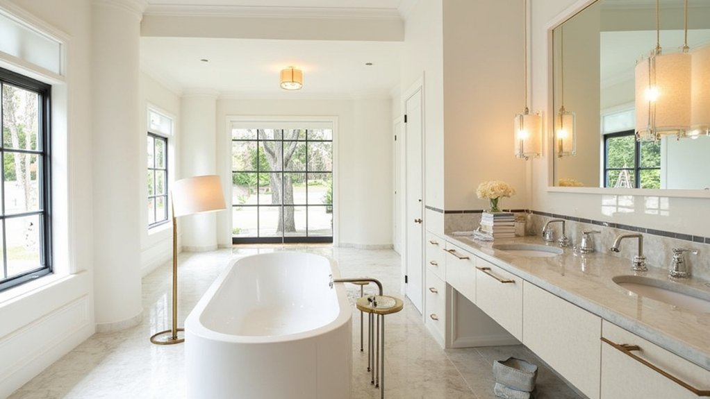 Your bathroom can become a calming escape with the right lighting to set the mood. Let’s explore statement lighting ideas that transform the space. “Lighting shapes atmosphere instantly,” says interior designer Jane Holt. Start with a pendant fixture, hung 60-66 inches above the floor for ideal brightness. There’s much more to uncover with nine other innovative options waiting to shift your bathroom’s vibe completely. Curious? Keep exploring!
