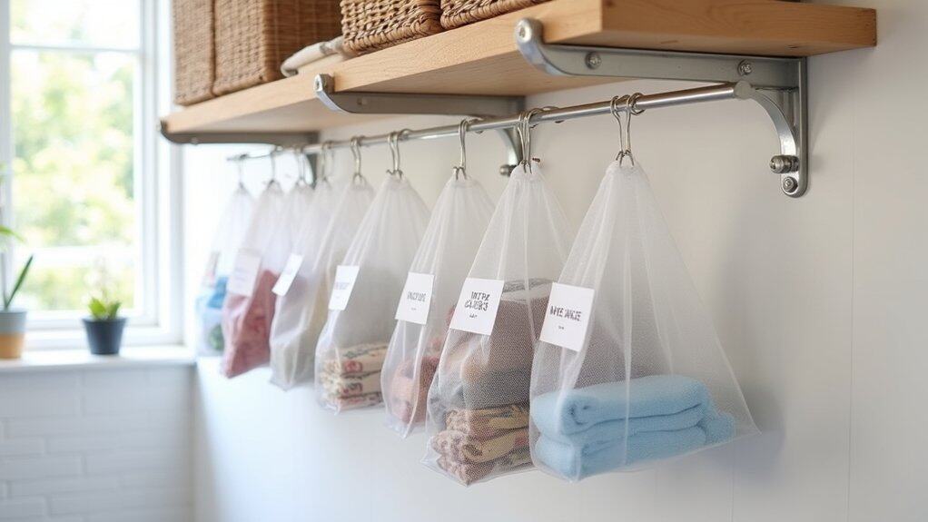 To maximize efficiency, label the mesh bags or use color-coded ones to quickly identify contents without rummaging through them. Ascertain the bags are hung securely to avoid overloading, as excessive weight can damage the hooks or rods. This simple hanging system also allows for better air circulation, which is ideal for damp items like washcloths or reusable dryer balls awaiting use.
