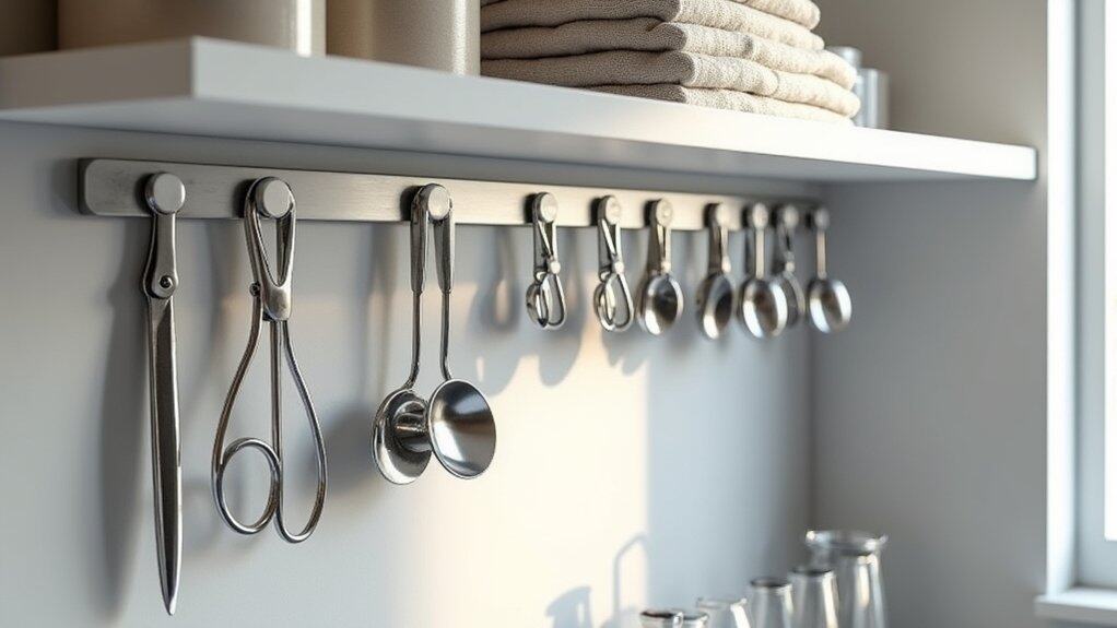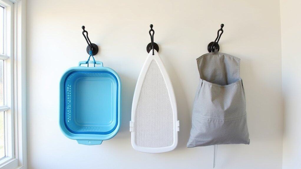 To install wall hooks, start by identifying a suitable spot on the wall near or above your laundry room shelves, guaranteeing they are easily accessible yet out of the way of daily tasks. Use a stud finder to locate wall studs for secure mounting, or opt for heavy-duty wall anchors if studs are not available. Mark the positions with a pencil, drill pilot holes if needed, and fasten the hooks tightly to guarantee they can handle the load without loosening over time.
