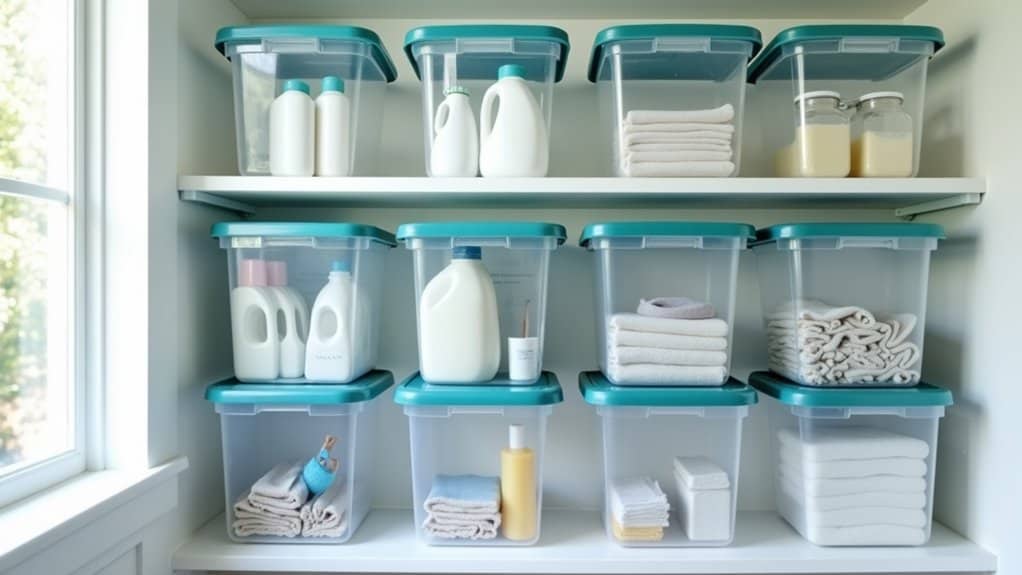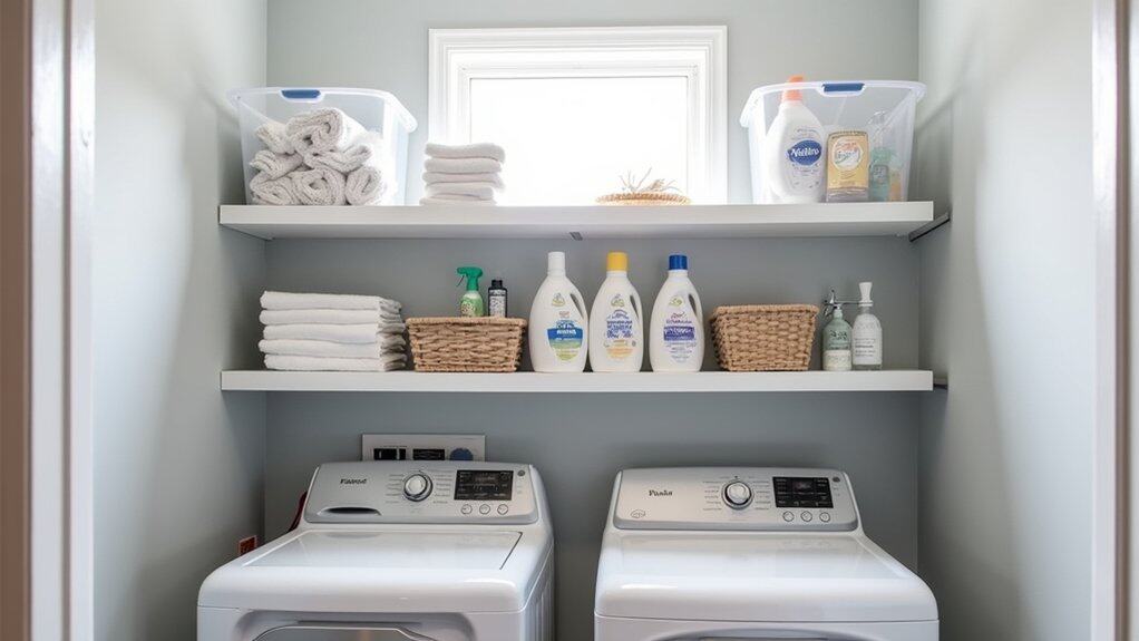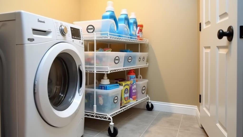 Using labeled baskets helps categorize items, making it simple to find what you need without rummaging through clutter. Group similar items together in each basket to maintain order and guarantee everything has a designated spot. This system not only streamlines your laundry routine but also makes restocking and tidying up a breeze.
