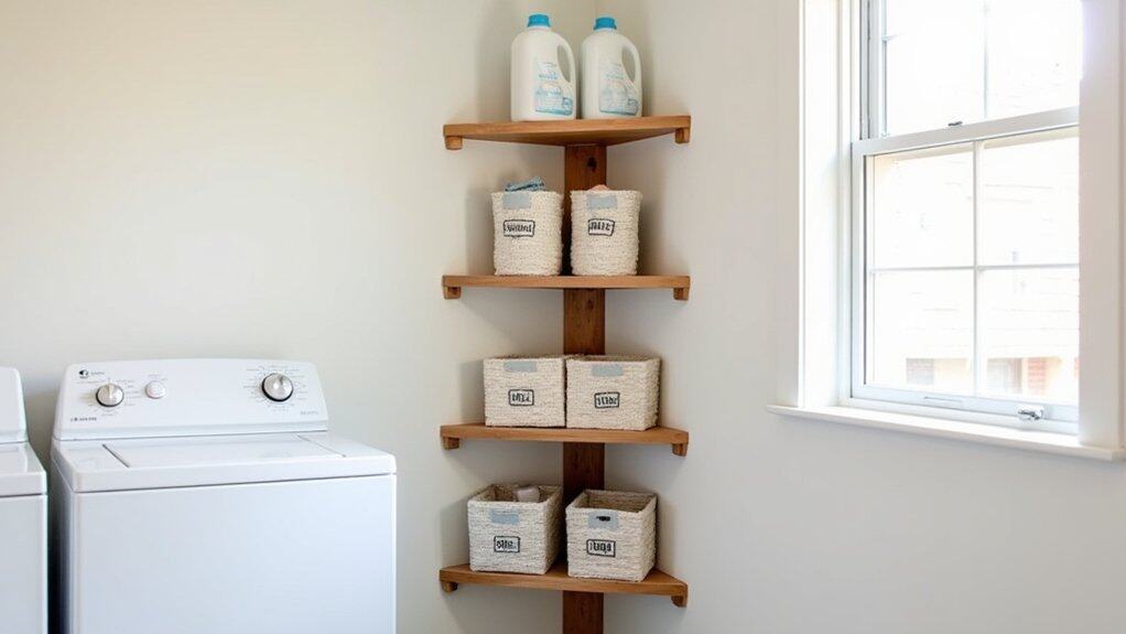 Installing corner shelf units in a laundry room is an excellent way to maximize unused space and enhance storage capacity. Start by measuring the corner area to guarantee the shelf unit fits snugly without obstructing nearby appliances or doors. Choose a sturdy, adjustable corner shelf that can hold heavier items like detergent bottles or fabric softeners while maintaining stability.
