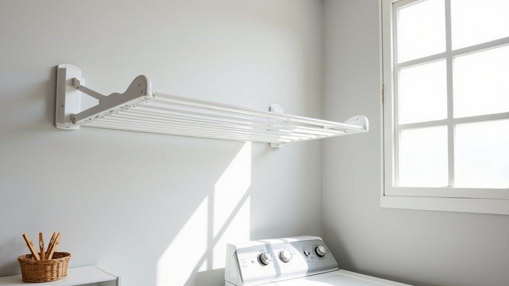 A folding drying rack is a practical addition to your laundry room, offering a space-saving solution for drying delicate items or clothes that can’t go in the dryer. Mount a wall-mounted folding rack on a sturdy surface near your shelves to keep it accessible yet out of the way when not in use. Verify the rack is installed at a height that allows easy unfolding and loading without obstructing other storage areas.
