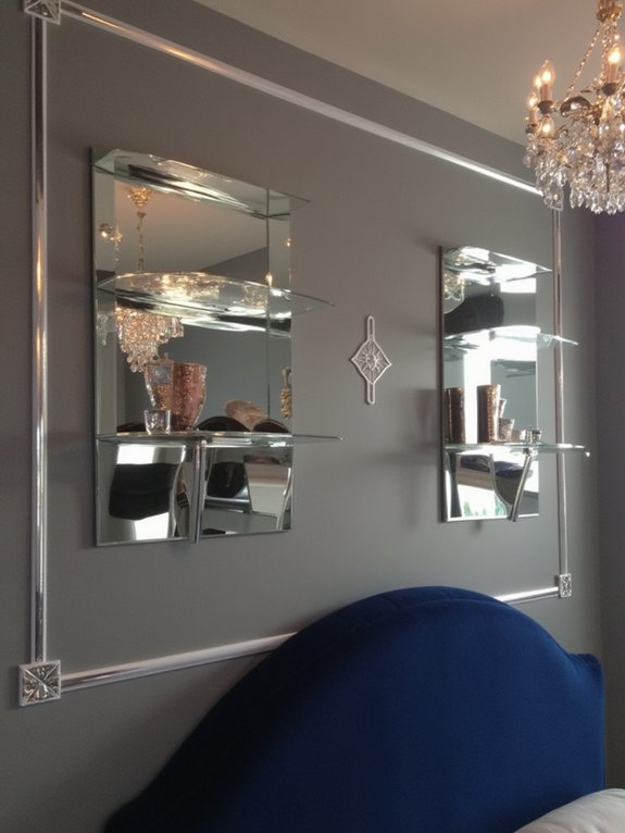 Silver mirrored floating shelves add Art Deco sophistication to bedroom walls while offering practical storage. Their reflective surfaces work with existing mirrors and metallic elements to enhance depth and visual interest in the space.