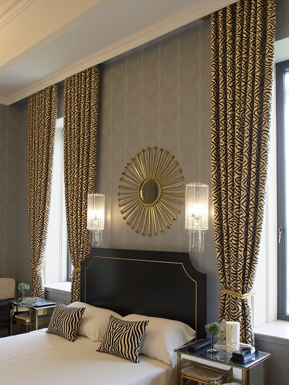 Metallic-trimmed zebra curtains combine bold black-and-white patterns with shimmering gold or silver accents, creating dramatic Art Deco-inspired window treatments. The zebra stripes provide dynamic visual interest while the metallic elements reflect light, making windows striking focal points in bedroom design.