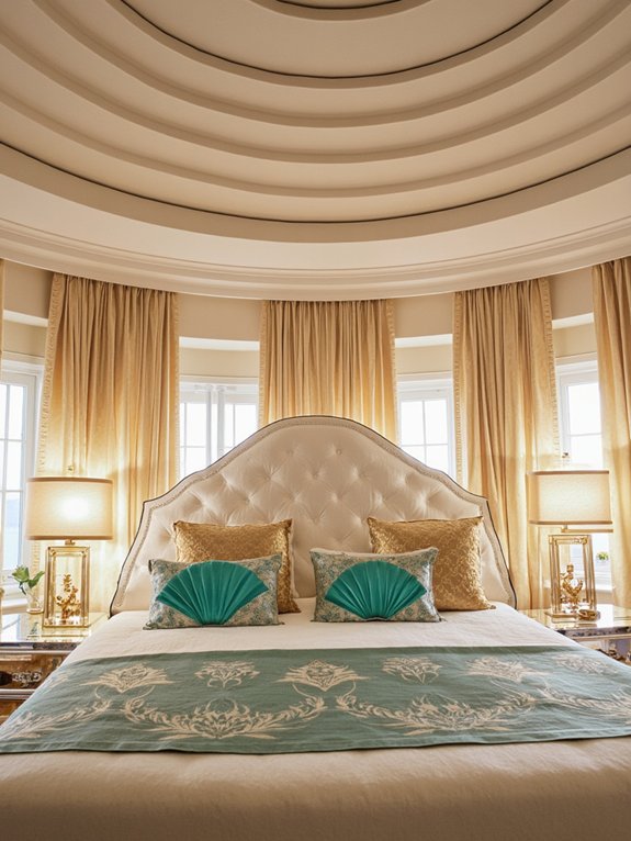 Fan-shaped silk accent pillows bring elegant focal points to Art Deco bedroom designs through their luxurious textures and geometric patterns. These decorative pieces create a sophisticated layered look while adding both comfort and visual interest to beds and chaise lounges.
