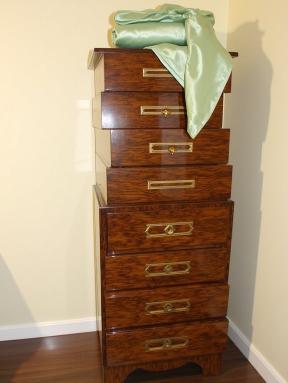 The Stepped Art Deco Linen Cabinet rises 72 inches high with a dramatic silhouette defined by graduated tiers. Its authentic art deco styling features polished brass handles and lacquered wood finishes, combining decorative elegance with practical storage.