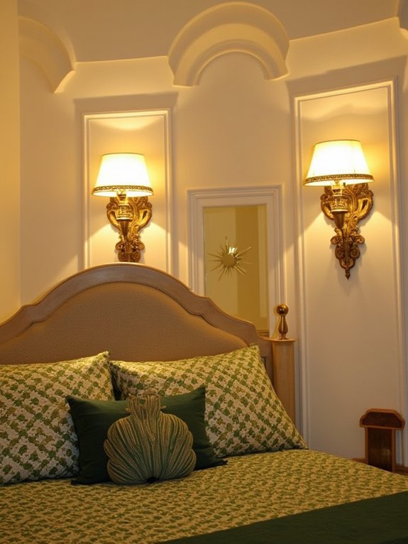 Bronze scalloped wall sconces combine Art Deco elegance with practical lighting solutions for bedrooms. Their curved designs enhance geometric room elements while the bronze finish adds sophisticated warmth to the space. Properly positioned at 60-65 inches high and 24-30 inches from the bed, these fixtures serve dual purposes of task and ambient lighting.