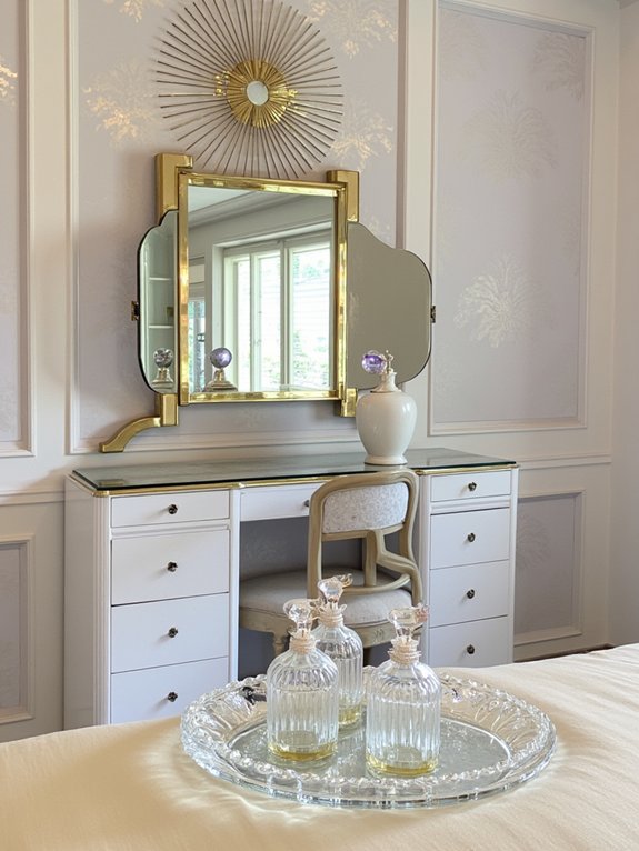 A Crystal Perfume Tray Display creates an elegant vanity centerpiece while providing practical storage for fragrances. The vintage-inspired arrangement features a geometric Art Deco mirrored tray adorned with carefully curated perfume bottles, crystal stoppers, and delicate vintage charms.