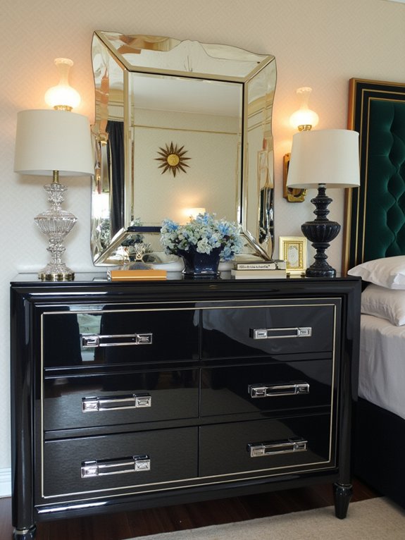The lacquered black dresser set combines sophistication with dramatic style, featuring a high-gloss finish that catches light and creates visual impact. Its streamlined silhouette and polished surface exemplify classic Art Deco design elements while offering versatile decorating options through metallic hardware choices.