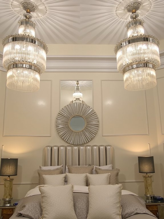 Platinum pendant lamps from the Jazz Age era blend timeless elegance with sophisticated lighting for Art Deco bedrooms. These fixtures showcase geometric patterns and chrome accents that harmonize with other metallic elements, while their suspended design creates visual interest and provides practical task lighting.