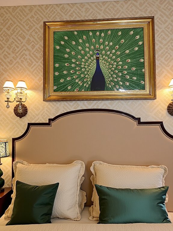 This striking Art Deco wall piece features a peacock design encased in an ornate gold frame. The artwork combines the era’s signature geometric patterns with the natural splendor of peacock plumage, creating a bold statement that embodies vintage glamour. The metallic accents catch and reflect light, adding dimension to any bedroom space.