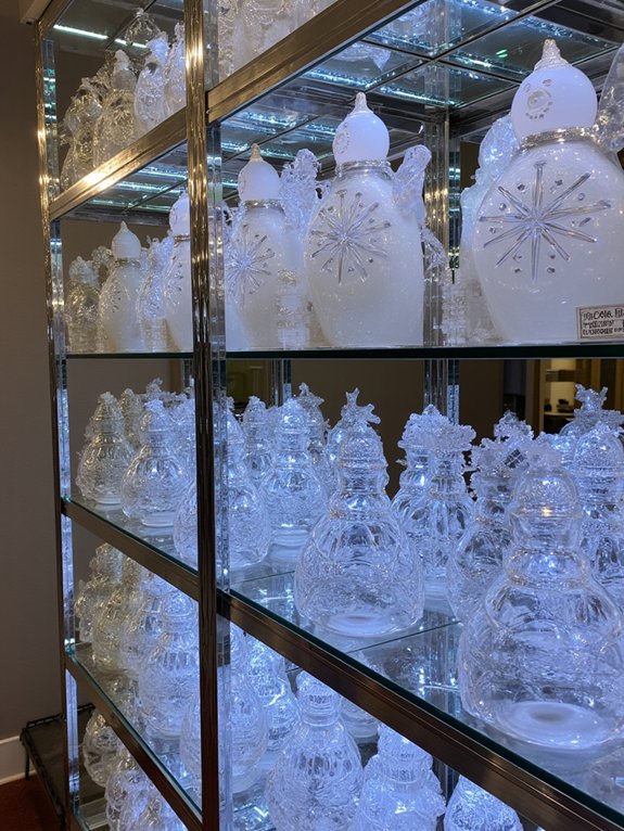 The display is enhanced by strategic positioning, with taller snowmen at the back and smaller ones in front. LED tea lights placed behind the crystal figures provide gentle illumination, while artificial snow and mirrored surfaces complete the magical winter atmosphere.