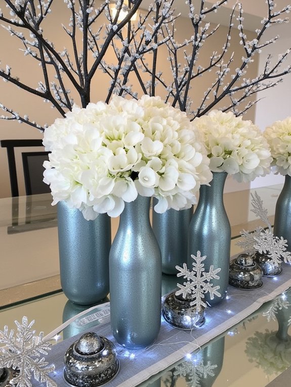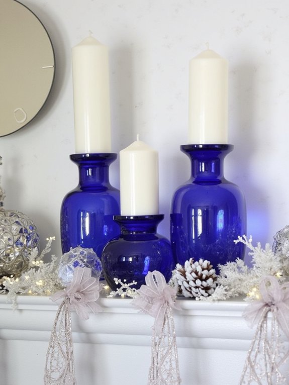 Blue-tinted mercury glass vases offer classic vintage appeal and ethereal beauty for holiday decorating. These distinctive pieces create enchanting centerpieces when adorned with white branches, pinecones, or delicate string lights, with designers favoring arrangements in odd-numbered groupings for optimal visual effect.
