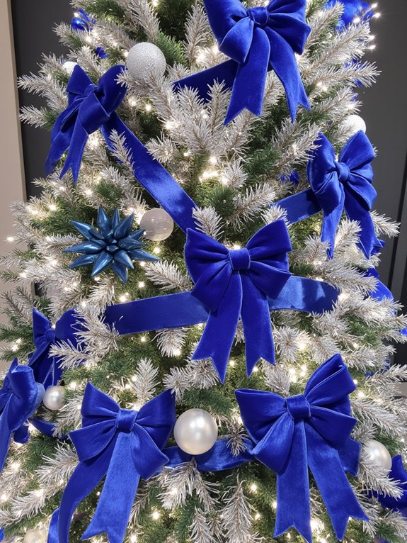 Velvet bows crafted from rich blue ribbon create elegant holiday accents that elevate Christmas decor. The luxurious texture and deep sapphire tones bring sophistication to wreaths, tree ornaments, and banister garlands.