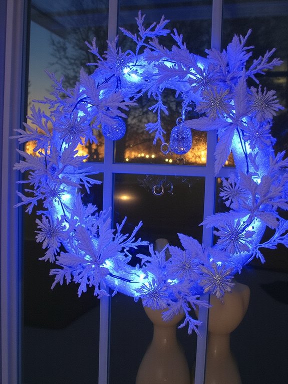 Window wreaths adorned with blue LED lights create enchanting holiday displays that transform ordinary windows into magical focal points. The cool blue glow radiates both indoors and outdoors, offering a welcoming sight for visitors and passersby during the festive season.