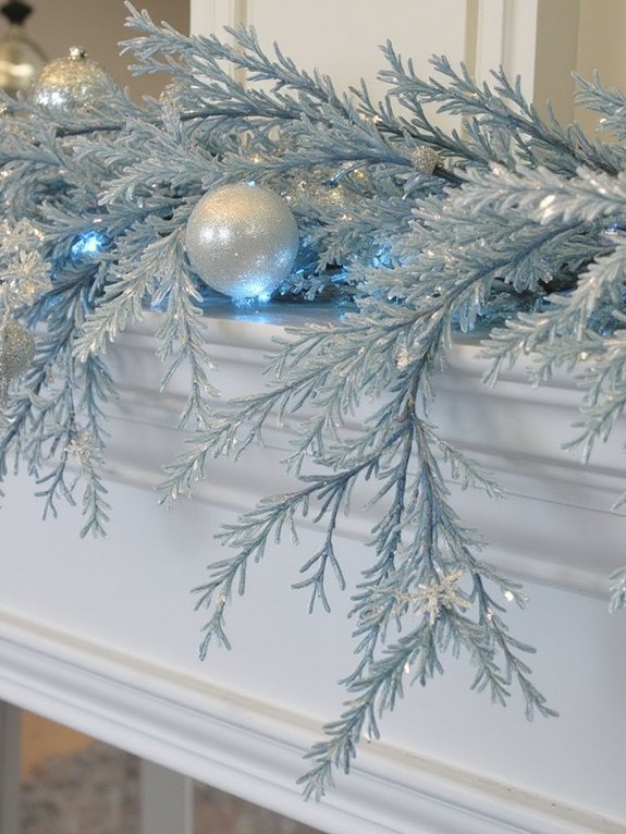 For optimal impact, pair the garlands with white LED lights, crystal ornaments, and silver ribbons. Arrange the branches in natural-looking curves and maintain their frosty appearance with occasional artificial snow misting. The blue tones and icy textures make these garlands a perfect choice for winter wonderland-themed holiday decor.
