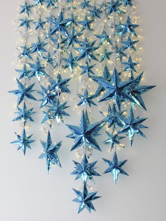 Create striking visual displays by hanging metallic star clusters at staggered heights between 24-36 inches. The stars, ranging from 4-12 inches in size, combine both matte and glossy blue finishes. Group them in asymmetrical arrangements of 3, 5, or 7 stars for optimal aesthetic impact.