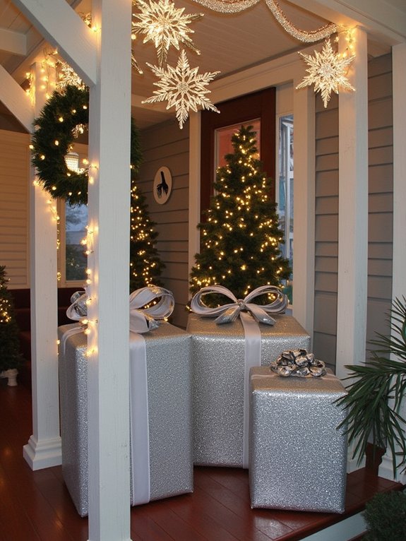 Stacked gift box displays create a festive holiday focal point for front porches and entryways. Using weather-resistant materials like plastic or metal boxes wrapped in waterproof coverings, these decorative arrangements can be assembled in descending sizes to form an eye-catching vignette that welcomes visitors throughout the season.