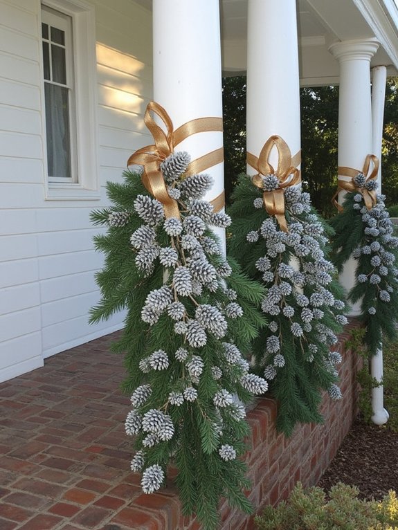 Create festive porch swags by combining glitter-dusted pinecones with fresh evergreen boughs. Space the pinecones evenly along the branches, securing them with floral wire. Weave metallic ribbon throughout and add battery-powered LED lights for a magical evening glow.