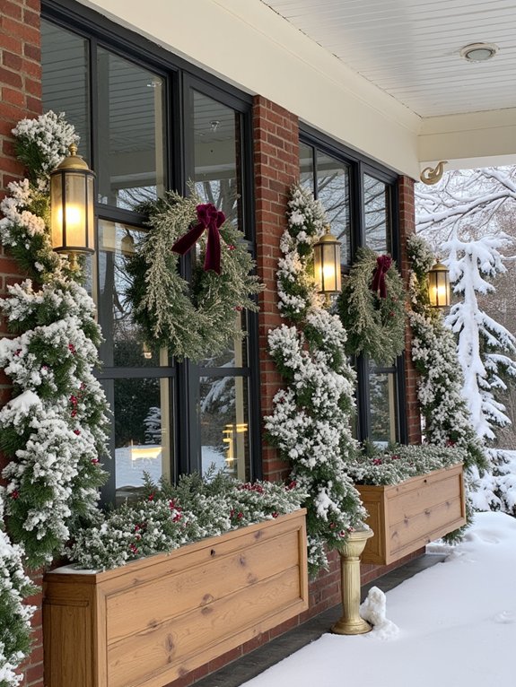 Custom window box arrangements transform ordinary planters into stunning holiday focal points, combining seasonal foliage with hardy winter flowers. These eye-catching displays add dimension and visual interest to front porch Christmas decor throughout the winter months.