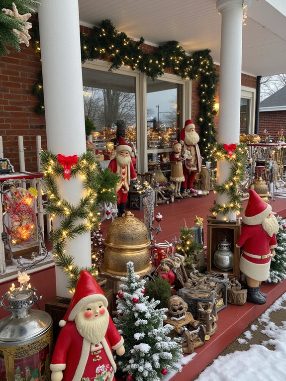 A vintage Santa collection display transforms an ordinary front porch into a magical holiday scene, showcasing cherished decorations from years past. Weatherproof display cases protect the precious pieces while LED spotlights illuminate each figure for optimal viewing.