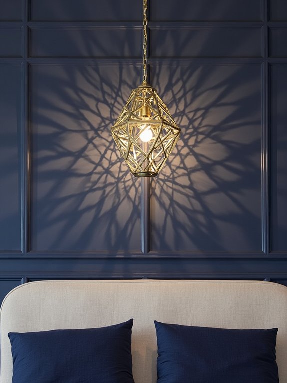 Navy geometric light fixtures combine modern architectural shapes with deep blue tones to create dramatic focal points in bedroom design. These contemporary pieces range from pendant lights to flush mounts, offering sophisticated illumination while making a bold design statement.