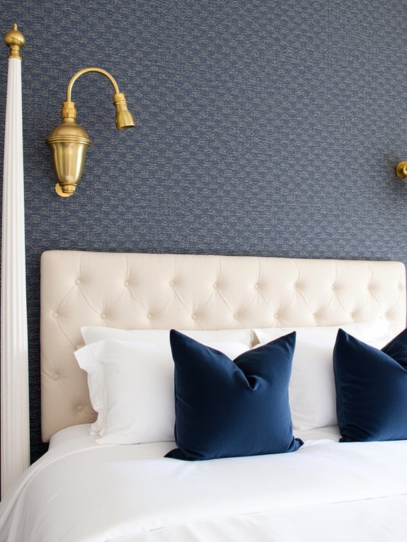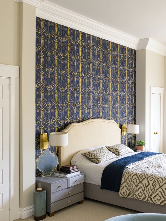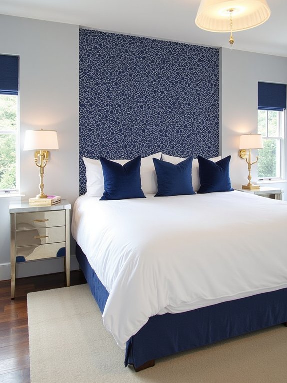 Navy-patterned accent wallpaper offers a sophisticated way to enhance bedroom design beyond solid walls. The variety of modern patterns, from subtle geometrics to bold florals, allows flexibility in matching different design aesthetics while adding visual depth and interest. For maximum impact, designers typically recommend applying the wallpaper to the wall behind the bed.