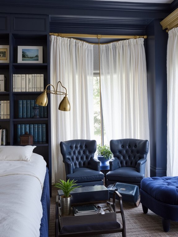 A navy leather reading nook creates an elegant retreat within the bedroom, featuring a sumptuous leather armchair positioned thoughtfully in a quiet corner. The rich navy hue adds depth and sophistication, while ambient lighting from a brass floor lamp provides perfect illumination for reading.