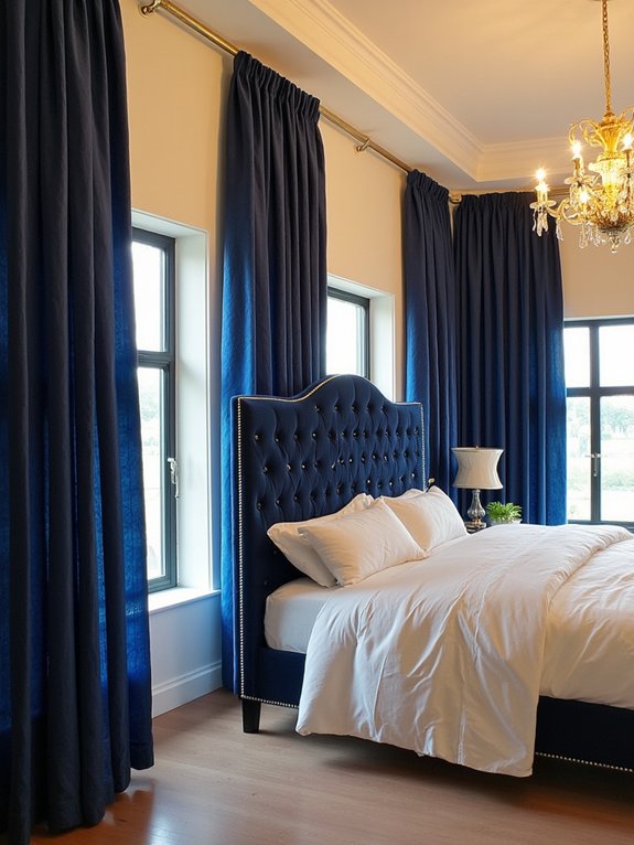 Navy silk window treatments create an elegant aesthetic through their fluid draping and light-reflective qualities. These luxurious panels serve both form and function, enhancing room displays while protecting interior elements from harsh sunlight.