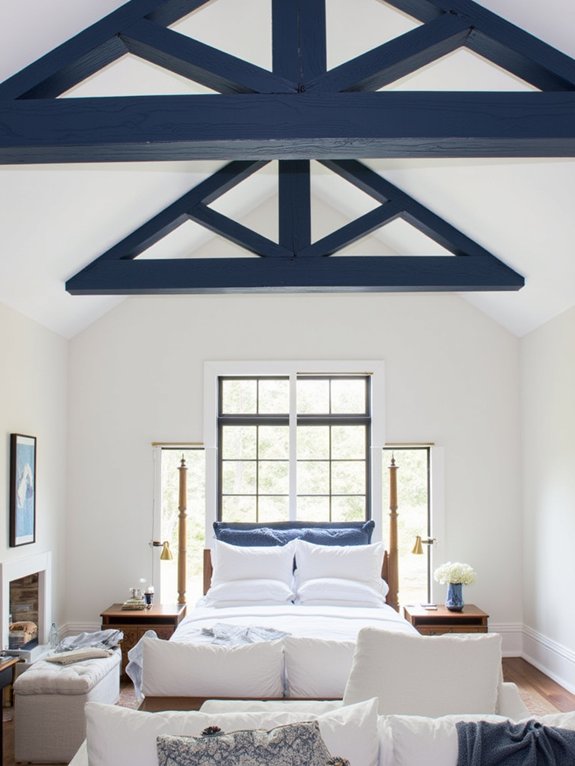 Navy painted wooden beams add architectural interest and sophistication to bedroom ceilings. The deep navy color creates dramatic shadows when combined with integrated beam lighting, transforming ordinary spaces into cozy retreats while drawing the eye upward.