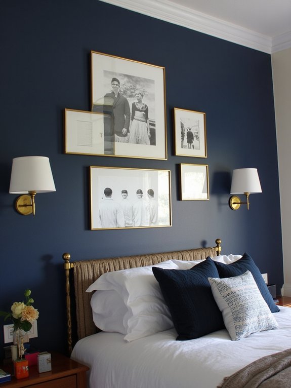 A gallery wall display against navy-painted walls creates dramatic visual interest when properly executed. By selecting frames in metallic finishes like gold or silver, the artwork stands out boldly against the deep blue background. The key is maintaining consistent spacing between pieces while mixing different frame sizes and art mediums.