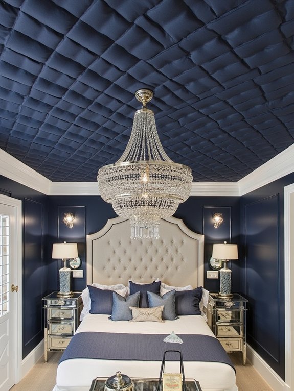 A navy tufted ceiling treatment elevates a bedroom into a sophisticated retreat, featuring plush upholstered panels in a classic diamond pattern. The deep navy fabric creates a dramatic overhead focal point while providing acoustic and insulation benefits.