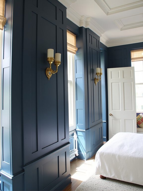 The dramatic contrast of navy panels works best when paired with lighter wall colors above, such as cream or grey tones. Adding crown molding at the panel tops creates a polished finish, completing the elegant transformation of ordinary bedroom walls into striking design features.