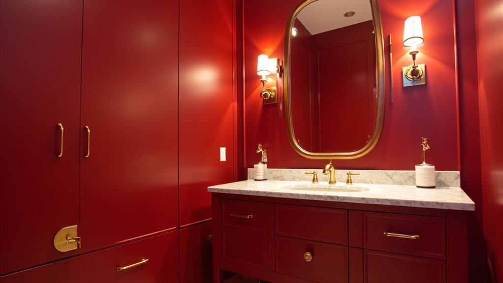 Moving from the invigorating appeal of teal, let’s explore a daring choice with a bold crimson hue for your powder room. This vibrant red can transform your small space into a striking statement in under a weekend.