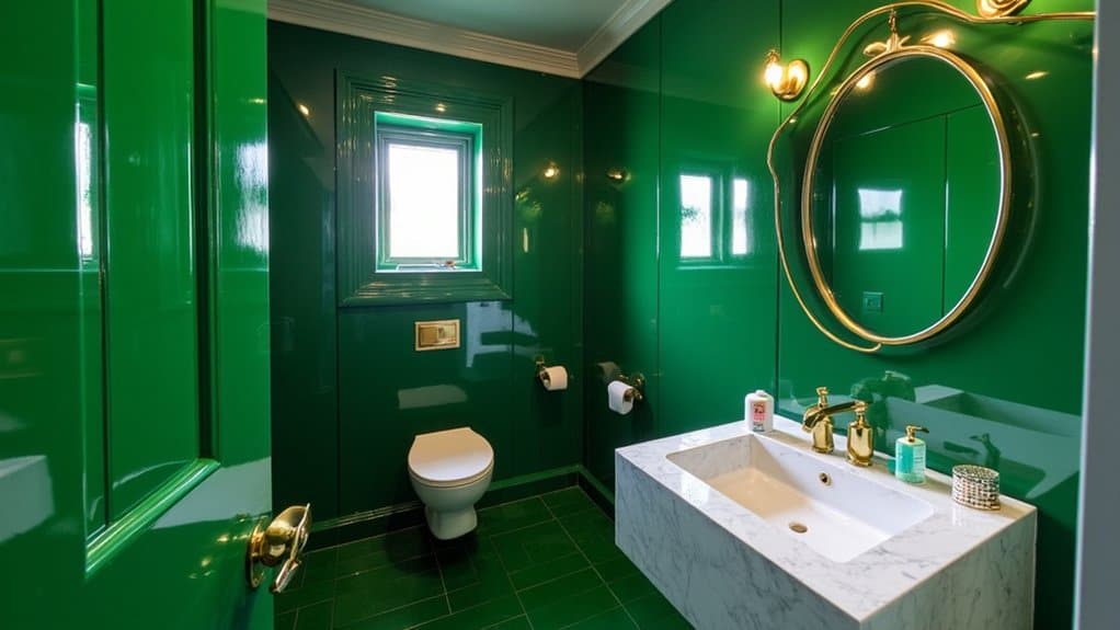 Switch gears to a striking option like Glossy Emerald Green for your powder room makeover. This bold shade transforms a small space with rich, vibrant depth. You’ll love how it reflects light, especially on walls measuring about 8×10 feet, creating a jewel-box effect.