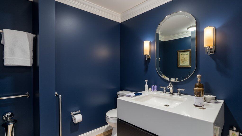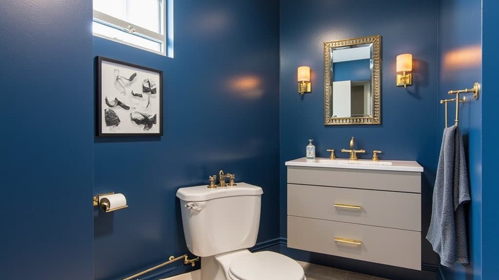 As we plunge into the next stunning option, let’s explore the mysterious charm of a deep indigo tone for your powder room. This rich, dark blue adds depth and sophistication instantly. You’ll transform a small 5×7-foot space into a cozy retreat with just a weekend’s work, about 6-8 hours total.