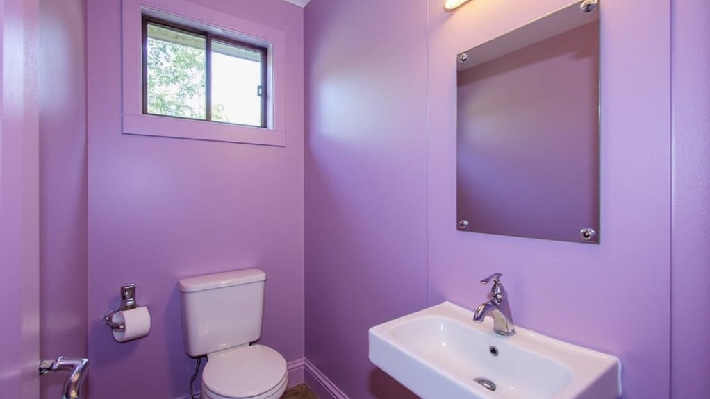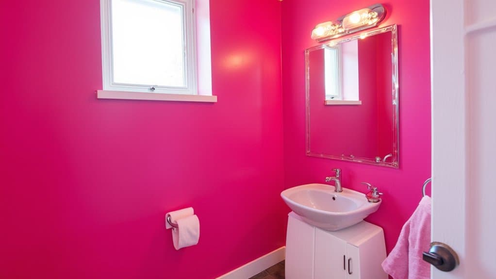 Let’s switch gears from the warm Radiant Tangerine Glow and brighten your powder room with Vibrant Fuchsia Flash. This bold pink shade instantly grabs attention, transforming your small space into a stunning focal point. You’ll love how it energizes a 5×7-foot room with minimal effort.
