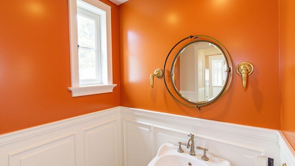 As you shift from the lively Striking Coral Pink, let’s plunge into the bold warmth of Radiant Tangerine Glow for your powder room. This vibrant shade energizes your small space with a sunny, citrus punch. Picture it on your walls, transforming a dull 5×6-foot room in just 4-6 hours of painting.