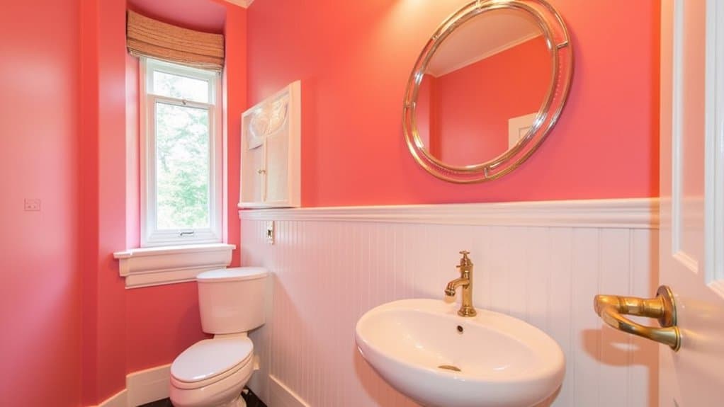 Moving from the moody depth of Dramatic Midnight Blue, let’s explore the vibrant energy of Striking Coral Pink for your powder room. This bold shade instantly grabs attention and transforms a small space. Paint your 5×7-foot room with a satin finish for a soft sheen; it takes about two hours per coat.