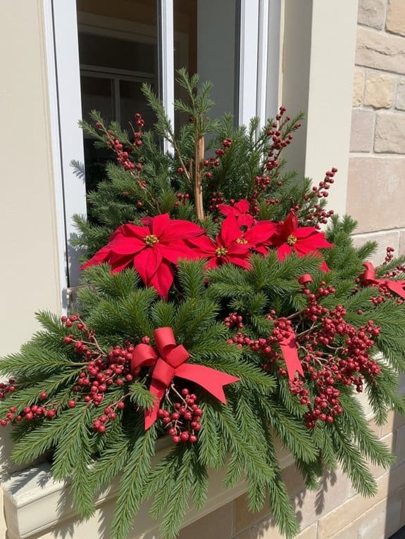 A Festive Window Box Display transforms ordinary window boxes into eye-catching holiday decorations using strategic layers of greenery and lights. Starting with a base of 12-inch pine or cedar branches provides the foundation, while red poinsettias add vibrant pops of traditional Christmas color.