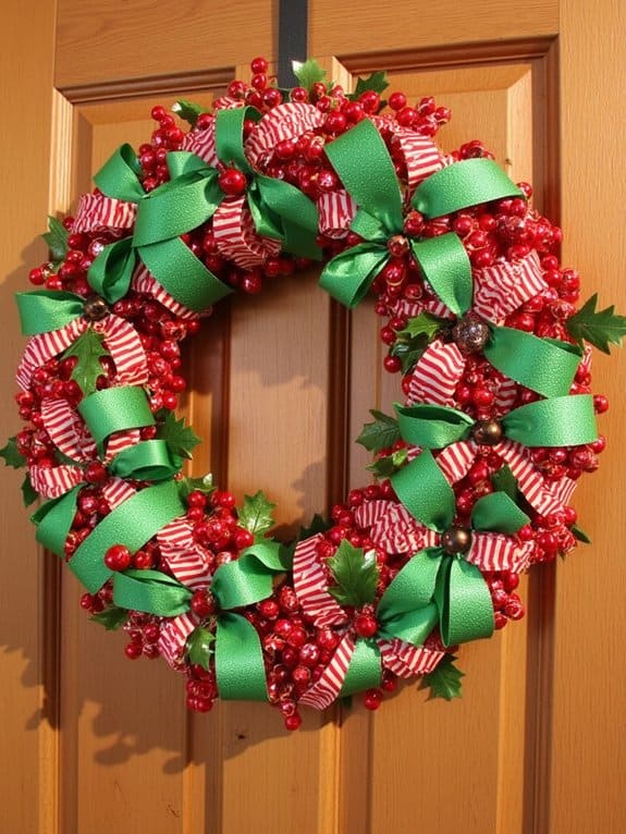 Create a festive Ribbon Candy Wreath by combining striped ribbon, wire, and glue into a charming door decoration. The wreath mimics the appearance of old-fashioned ribbon candy through carefully folded ribbon secured in a zigzag pattern around a wire circle.